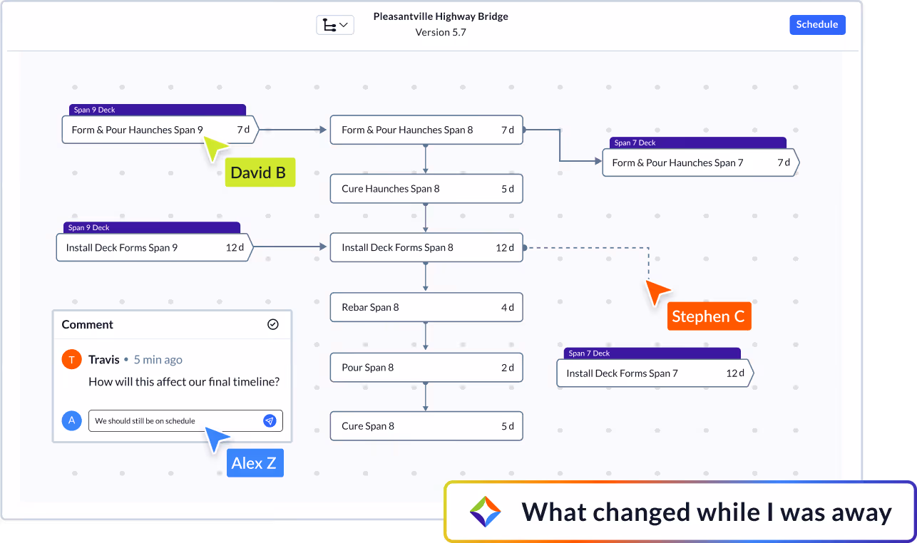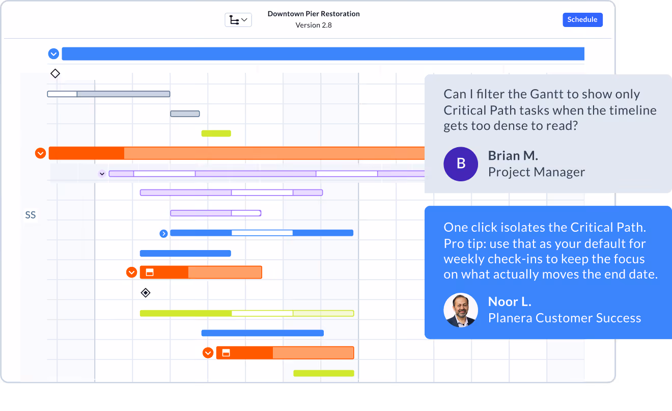 Planera's visual interface and drag-and-drop tools let you build, update, and share schedules in minutes, keeping the office and field connected for better outcomes. AI lets everyone better understand the schedule.